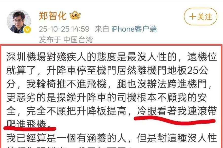 10 月 25 日,郑智化在社交平台发文控诉深圳机场服务 “没人性”。他透露,当日乘坐深圳航空 ZH9073 航班前往台北时,因近机位资源饱和被安排远机位登机。机场调配的残障人士登机车与机舱门出现高度差,他称 “升降车离机门地板 25 公分,轮椅推不进,司机冷眼旁观,我只能连滚带爬进飞机”。这番充满画面感的表述迅速引发网友共情,舆论纷纷指责深圳机场忽视残障人士权益。
